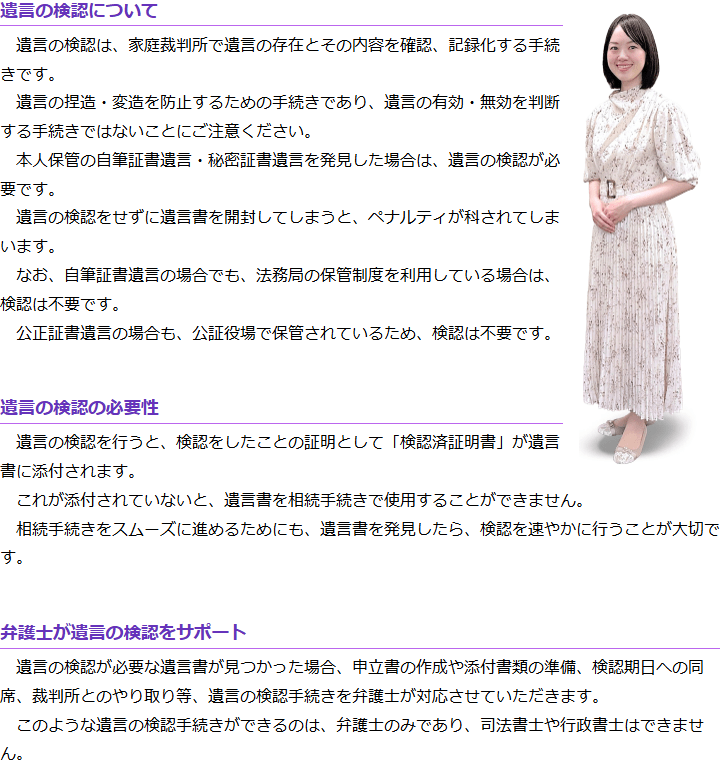 しかし、遺言の検認は、遺言書を保管している者あるいは発見した相続人が、遺言者の死亡を知った後、遅滞なく行わないといけないとされていますので、ご自身での対応が難しい場合は、弁護士へご依頼ください。